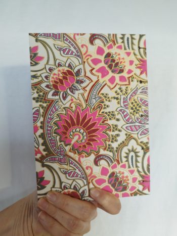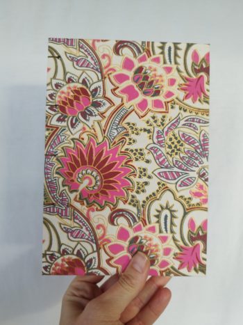 Il peut être utilisé en carnet d’écriture, ou mixte écriture et dessin. C’est une belle idée cadeau pour une personne créative, ainsi que les amateurs de papier artisanal indien aux beaux motifs floraux avec rehauts d’or.