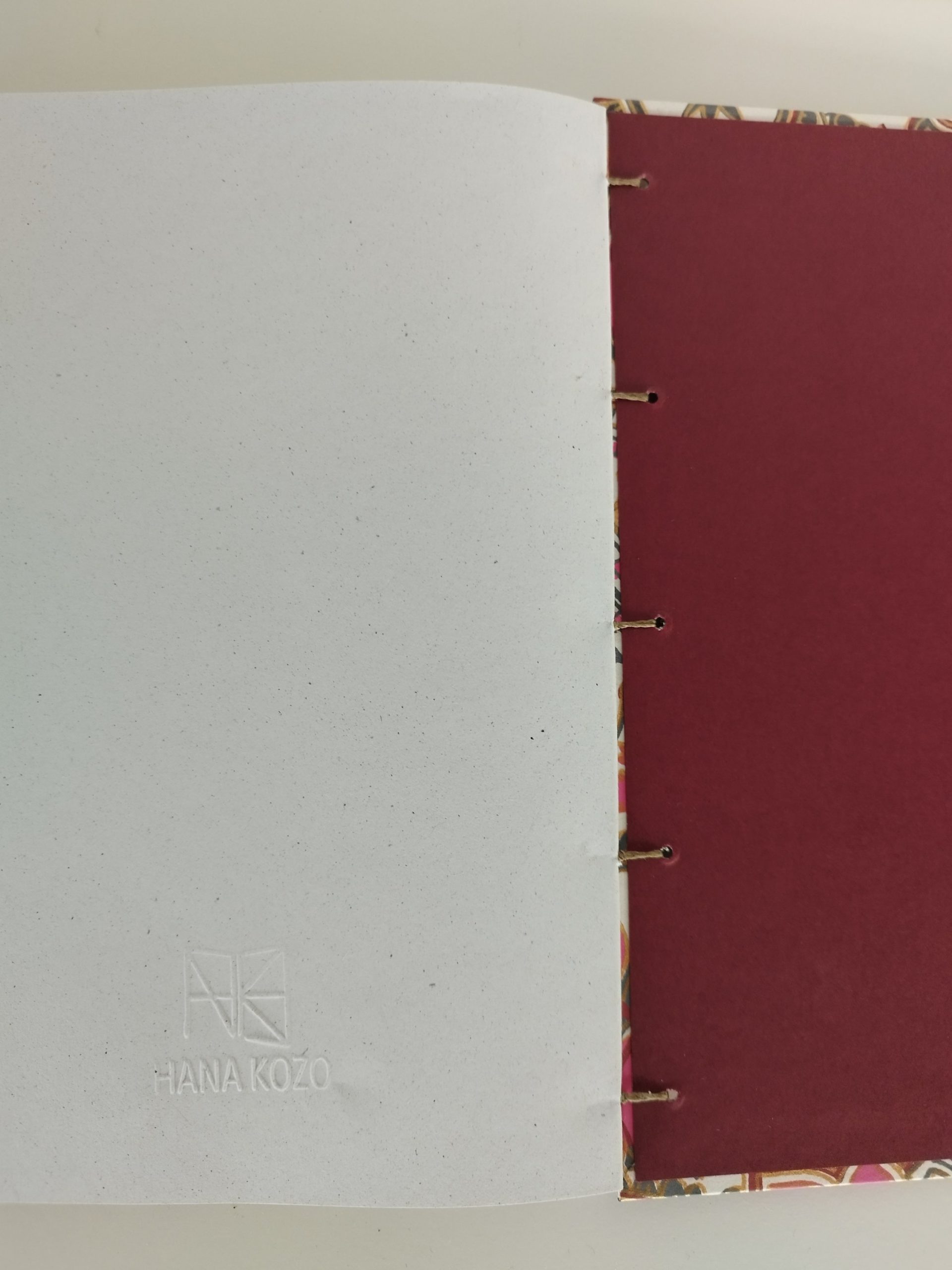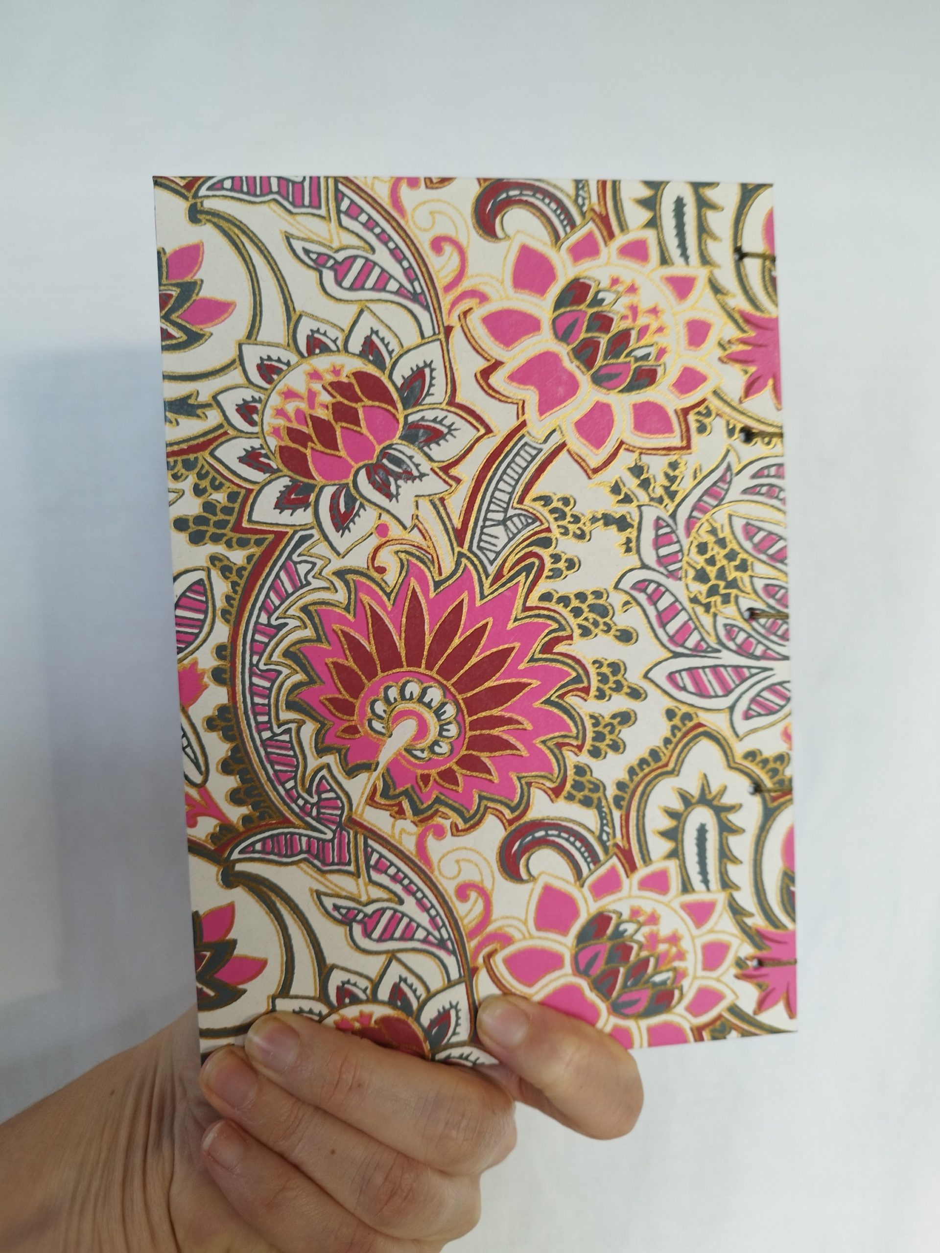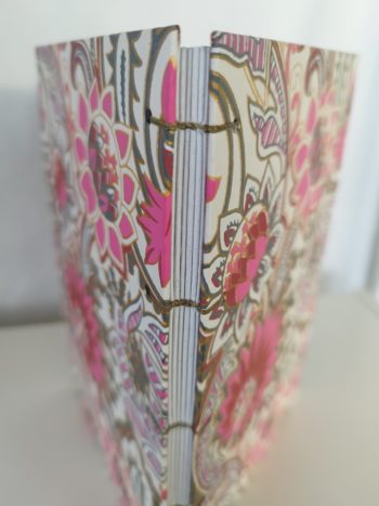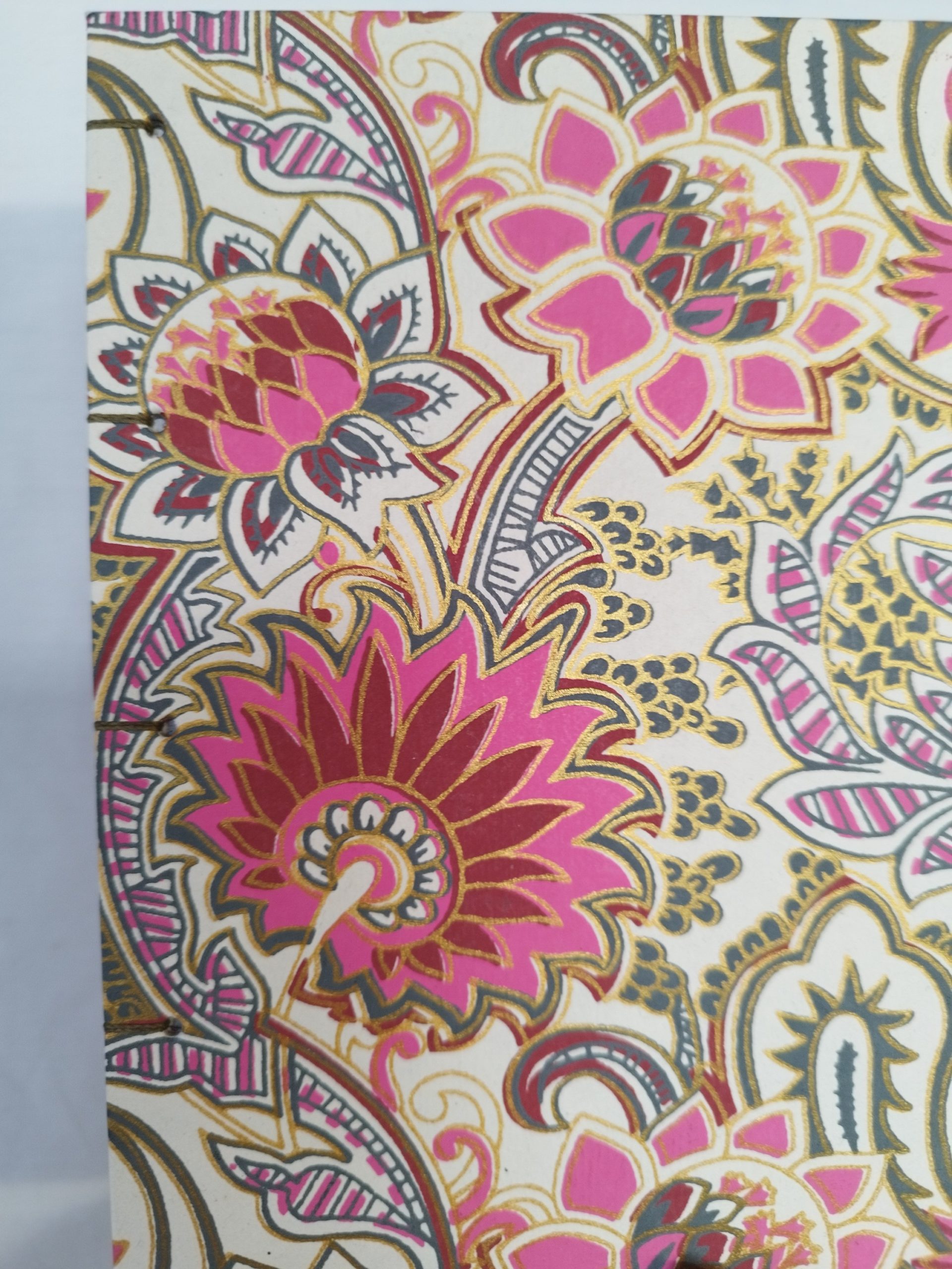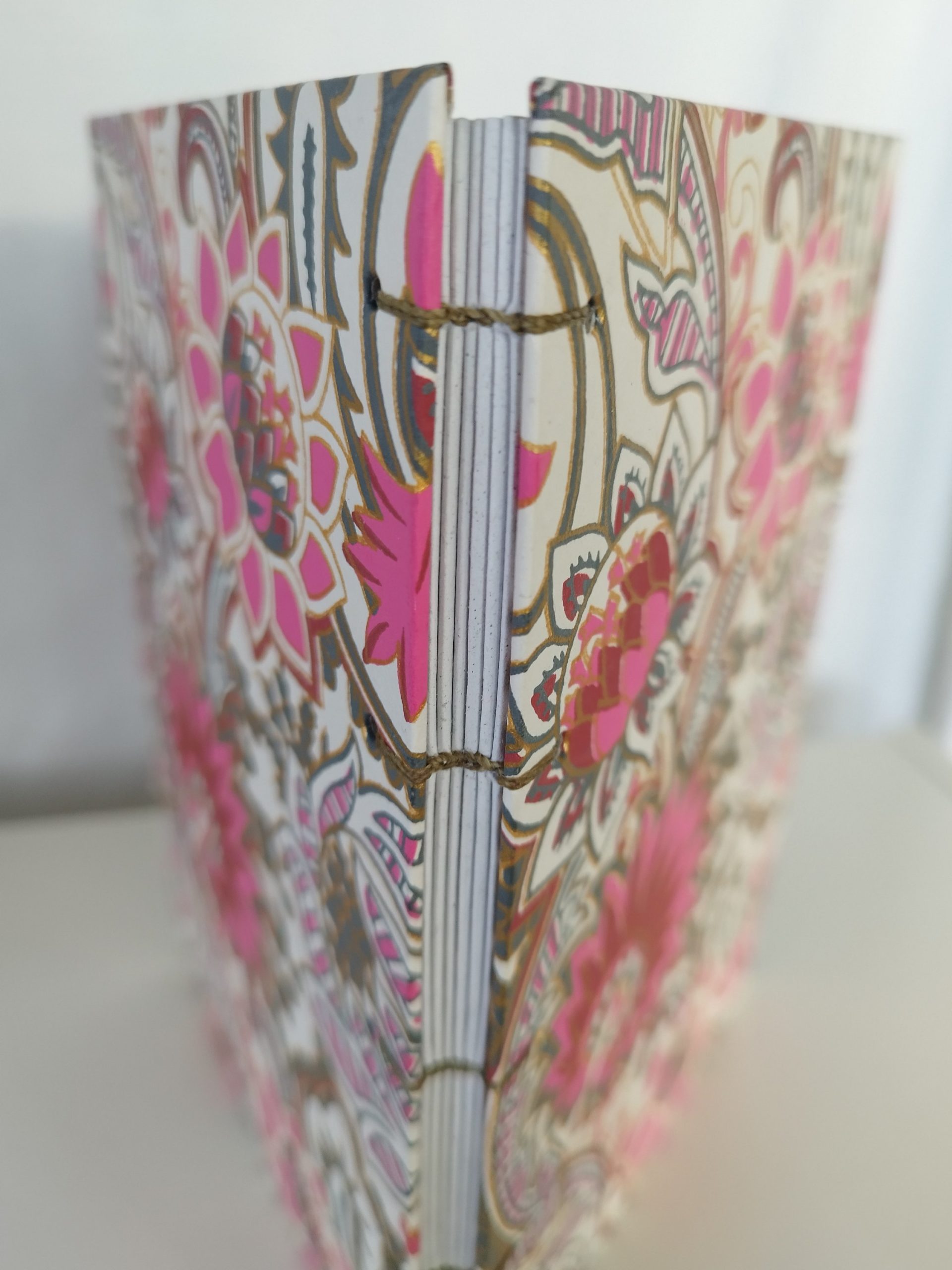 La couverture est fabriquée avec un papier indien artisanal que je suis allée sourcer à Jaipur. Un papier recyclé 100% coton avec un toucher proche du tissu et des motifs floraux roses et or. Le fil utilisé pour la reliure copte est un fil en polyester ciré de 4 brins.