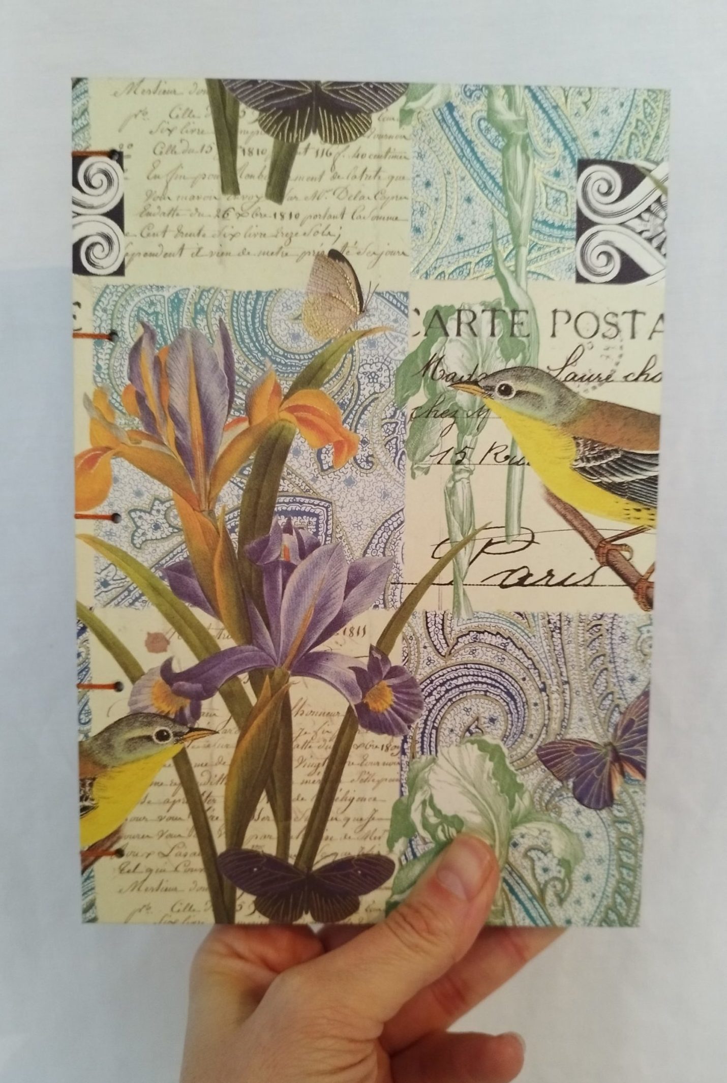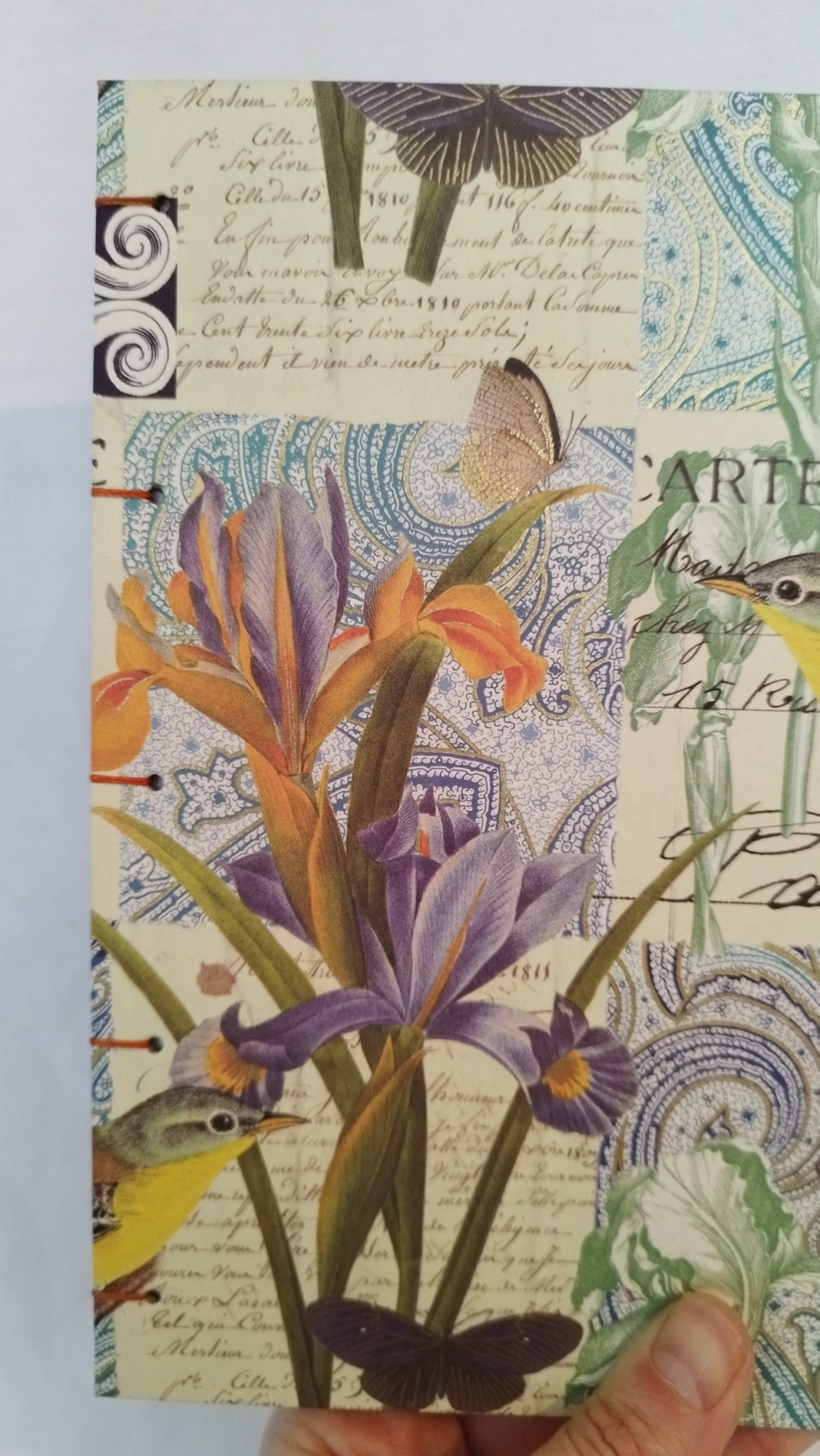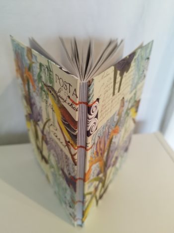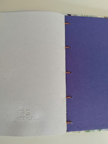 La couverture est fabriquée avec un papier italien aux motifs végétaux végétaux et oiseaux dans les tons vert, orange et violet. Le fil utilisé pour la reliure copte est un fil en polyester ciré de 4 brins.