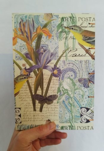 Il peut être utilisé en carnet d’écriture, ou mixte écriture et dessin. C’est une belle idée cadeau pour une personne créative, ainsi que les amateurs de papier italien aux tons violet et orange avec des fleurs et oiseaux.